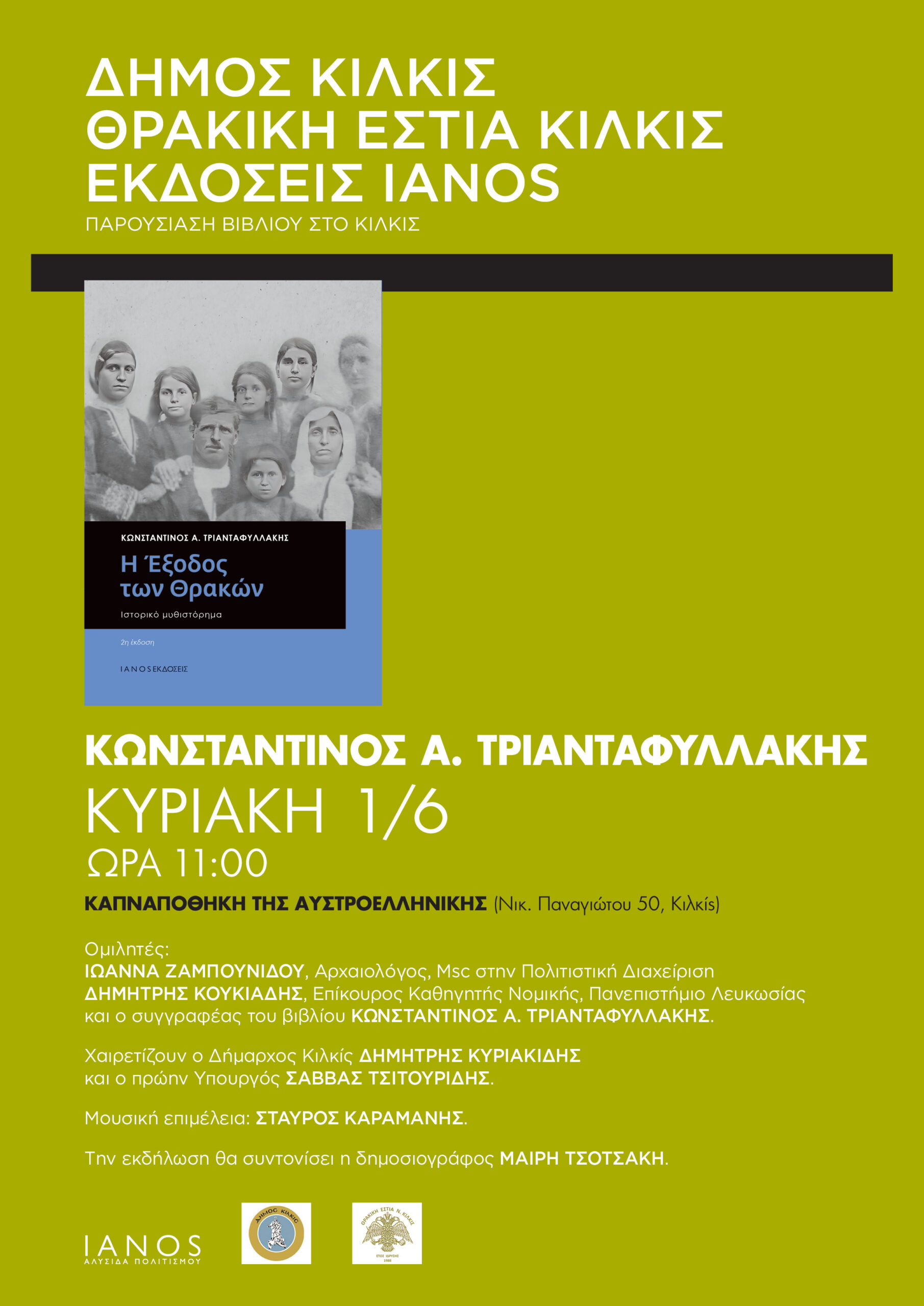Την Κυριακή 1 Ιουνίου, στις 11:00 ο Δήμος Κιλκίς, η Θρακική Εστία Κιλκίς και οι εκδόσεις IANOS, διοργανώνουν παρουσίαση του βιβλίου του Κωνσταντίνου Α. Τριανταφυλλάκη, με τίτλο «Η Έξοδος των Θρακών».
