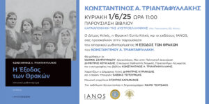 Κυκλοφορεί από τις εκδόσεις IANOS το 5ο βιβλίο του Κωνσταντίνου Α. Τριανταφυλλάκη, με τίτλο «Η ΕΞΟΔΟΣ ΤΩΝ ΘΡΑΚΩΝ». Ένα βιβλίο «φόρος τιμής» στην εκατόχρονη επέτειο από τον βάναυσο ξεριζωμό του πληθυσμού της Ανατολικής Θράκης· ένα έργο ζωής, μία «υποχρέωση», όπως λέει ο ίδιος, στη μνήμη των παππούδων του, που δεν σταμάτησαν ποτέ να ατενίζουν με νοσταλγία και βαθύ πόνο τα πατρογονικά εδάφη τους, εκεί, πέρα, στην απέναντι μεριά του Έβρου…