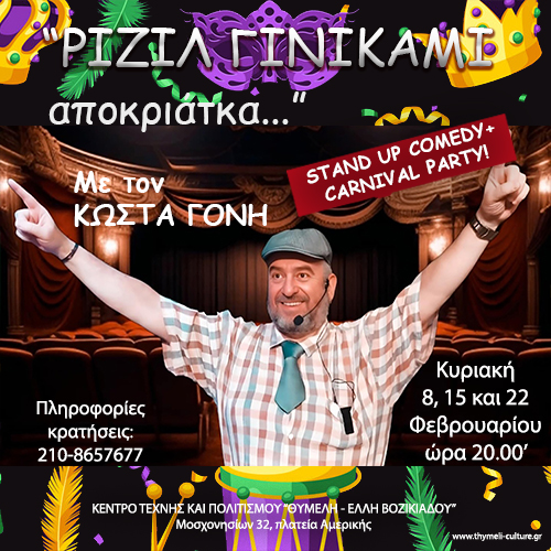 Το “Κέντρο Τέχνης και Πολιτισμού ΘΥΜΕΛΗ – ΕΛΛΗ ΒΟΖΙΚΙΑΔΟΥ” παρουσιάζει για τρεις μοναδικές Κυριακάτικες παραστάσεις το ξεκαρδιστικό stand-upcomedy: “ΡΙΖΙΛ ΓΙΝΙΚΑΜΙ…ΑΠΟΚΡΙΑΤΚΑ + CARNAVAL PARTY” με τον Κώστα Γόνη.