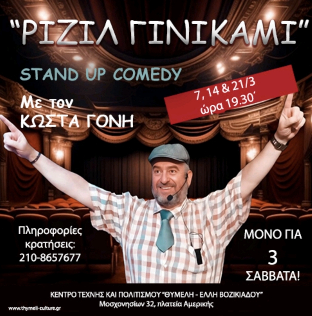 Το ‘Κέντρο Τέχνης και Πολιτισμού ΘΥΜΕΛΗ – ΕΛΛΗ ΒΟΖΙΚΙΑΔΟΥ’ λόγω της μεγάλης επιτυχίας που σημείωσε φιλοξενεί για τρεις τελευταίες παραστάσεις το Stand Up Comedy: ‘ΡΙΖΙΛ ΓΙΝΙΚΑΜΙ’ με τον Κώστα Γόνη.